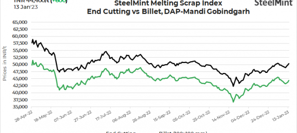 SteelMint’s domestic steel scrap (end-cutting) index rose by INR 600/tonne (t) to INR 44,400/t DAP Mandi Gobindgarh on 13 January, 2023.