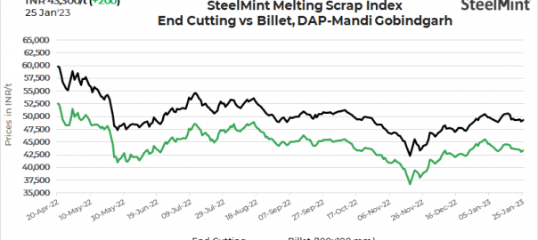 SteelMint’s domestic steel scrap (end-cutting) index rose by INR 200/tonne (t) to INR 43,300/t DAP Mandi Gobindgarh on 25 January, 2023.