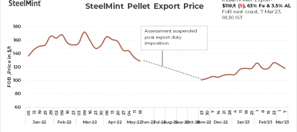 SteelMint’s India pellet (Fe 63%, 3% Al) export index FOB east coast was recorded at $118/t, down $5/t w-o-w amid low demand in China due to preference for low-grade iron ore.