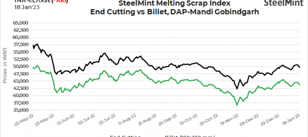 SteelMint’s domestic steel scrap (end-cutting) index fell by INR 700/tonne (t) to INR 43,700/t DAP Mandi Gobindgarh on 18 January, 2023. Low demand for semi-finished steel and finished products put downward pressure on scrap prices.