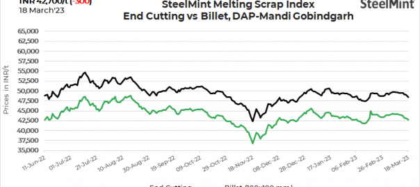 SteelMint’s domestic steel scrap (end-cutting) index fell by INR 300/tonne (t) to INR 42,700/t DAP Mandi Gobindgarh on 18 March, 2023. Low demand for semi-finished and finished steel put downward pressure on scrap prices.
