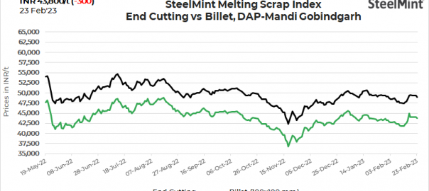 SteelMint’s domestic steel scrap (end-cutting) index fell by INR 300/tonne (t) to INR 43,800/t DAP Mandi Gobindgarh on 23 February, 2023. Low demand for semi-finished and finished steel put pressure on scrap prices.