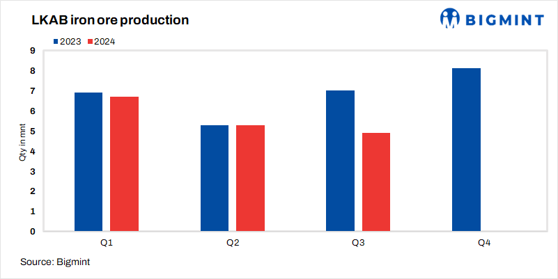- LKAB’s delivery volumes of iron ore products dropped by 6% to 5.9 mnt in Q3CY’24 against 6.3 mnt in Q3CY’23.