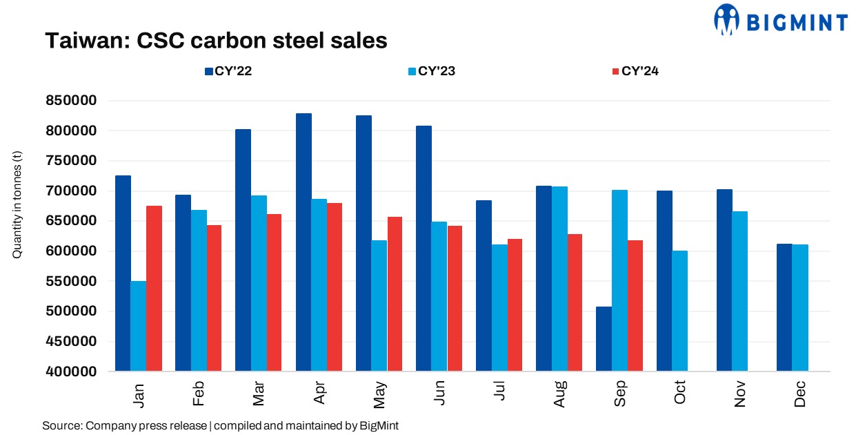 Steel sales of Taiwan-based China Steel Corporation (CSC) dropped by 11.7% to 618,676 t in Sep’24 as compared to 700,675 t in the same period last year. Moreover, the same fell by 2% against 628,927 t in Aug’24. Furthermore, for Jan-Sep’24, sales volume edged down by 1% to 5.83 mnt compared to 5.87 mnt in Jan-Sep’23.