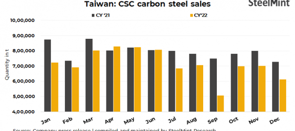 China Steel Corporation’s (CSC’s) steel sales fell by 13% m-o-m to 6,11,590 tonnes (t) in Dec’22, the same registered a 16% decline y-o-y against 7,26,885 t in Dec’21. The company’s cumulative steel sales dropped by 10% y-o-y to 8.58 mnt in CY’22 as compared to 9.55 mnt in CY’21.