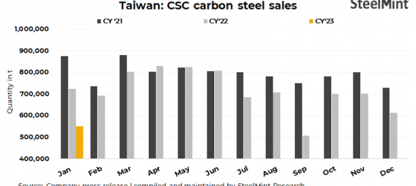 China Steel Corporation’s (CSC’s) steel sales fell by 24% on the year to 548,971 tonnes (t) in Jan’23 as against 724,225 t in the same period a year ago. Similarly, sales volumes registered a drop of 10% against 611,590 t in Dec’22.