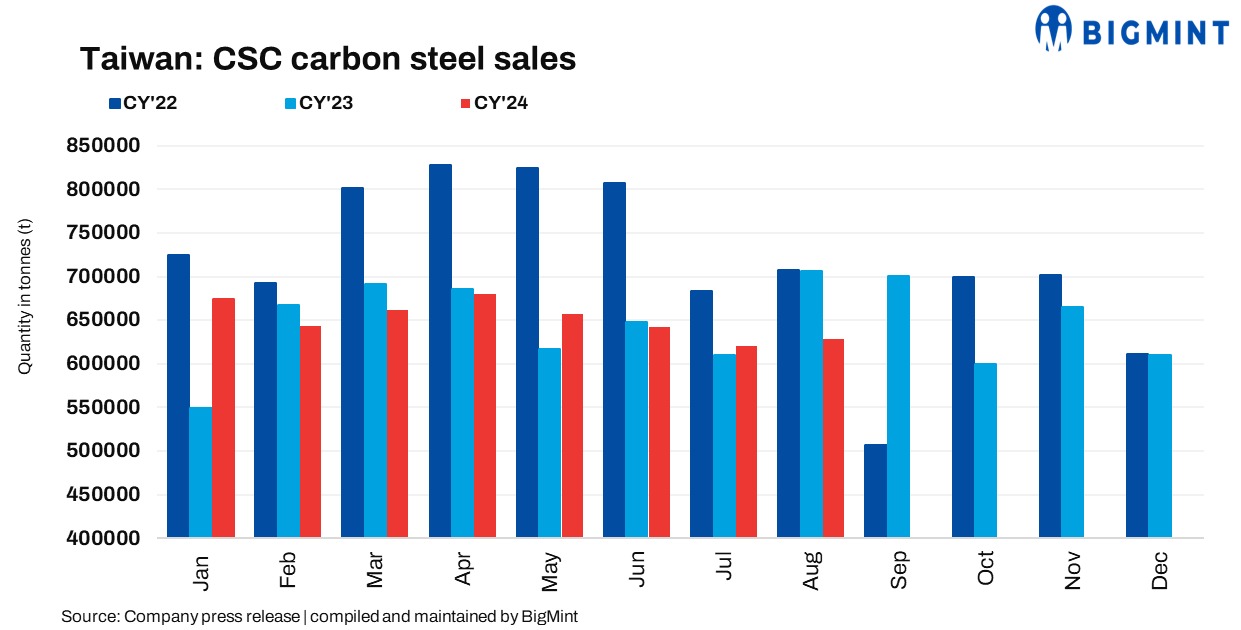 China Steel Corporation (CSC), Taiwan’s leading steelmaker, reported that its steel sales volume in Jan-Aug’24 remained largely stable at 5.209 mnt against 5.173 mnt in Jan-Aug’23. Moreover, in Aug’24, sales volume held steady m-o-m at 628,927 t but declined 10.9% y-0-y from 705,951 t in Aug’23.