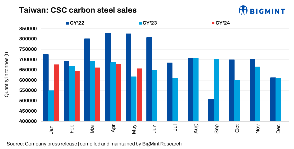 China Steel Corporation’s (CSC’s) steel sales volume rose by 6.6% y-o-y to 657,357 t in May’24 as compared to 616,666 t in the same period last year. However, on m-o-m basis, the same fell by 3% m-o-m against 680,086 t in Apr’24. Moreover, for Jan-May’24, sales volume went up by 3% y-o-y to 3.32 mnt compared to 3.21 mnt in Jan-May’23.