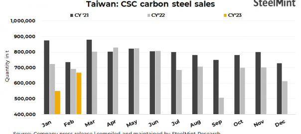 China Steel Corporation (CSC) recorded steel sales at 667,207 t in Feb’23. The volumes rose by 22% m-o-m as compared to 548,971 t in Jan’23. However, on a y-o-y basis, the same registered a drop of 4% as against 692,704 t in Feb’22.