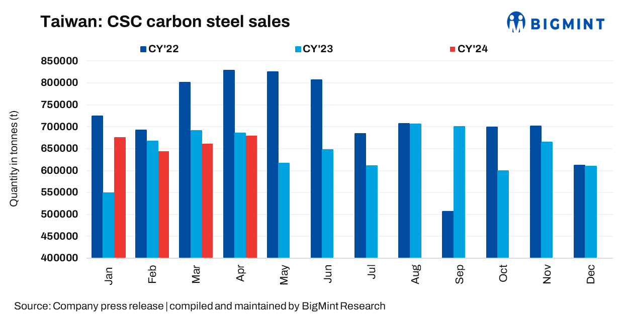 China Steel Corporation’s (CSC’s) steel sales volume decreased by 1.6% y-o-y to 680,086 t in Apr’24 as compared to 691,344 t in the same period last year. However, on m-o-m basis the same increased by 3% m-o-m against 661,636 t in Mar’24. Moreover, for Jan-Apr’24, sales volume rose by 3% y-o-y to 2.66 mnt compared to 2.59 mnt in Jan-Apr’23.
