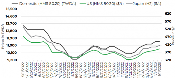 Scrap prices in the global market have been steadily increasing lately, with the price of US-sourced HMS 1&2 80:20 material rising to $393/t CFR Taiwan as of January 9, up for the seventh consecutive week by another $8/t from one week before. During the same period, the price of Japan-origin H2 scrap also posted an on-week rise of $10/t to touch a four-month high of $415/t CFR Taiwan, according to a local market source.