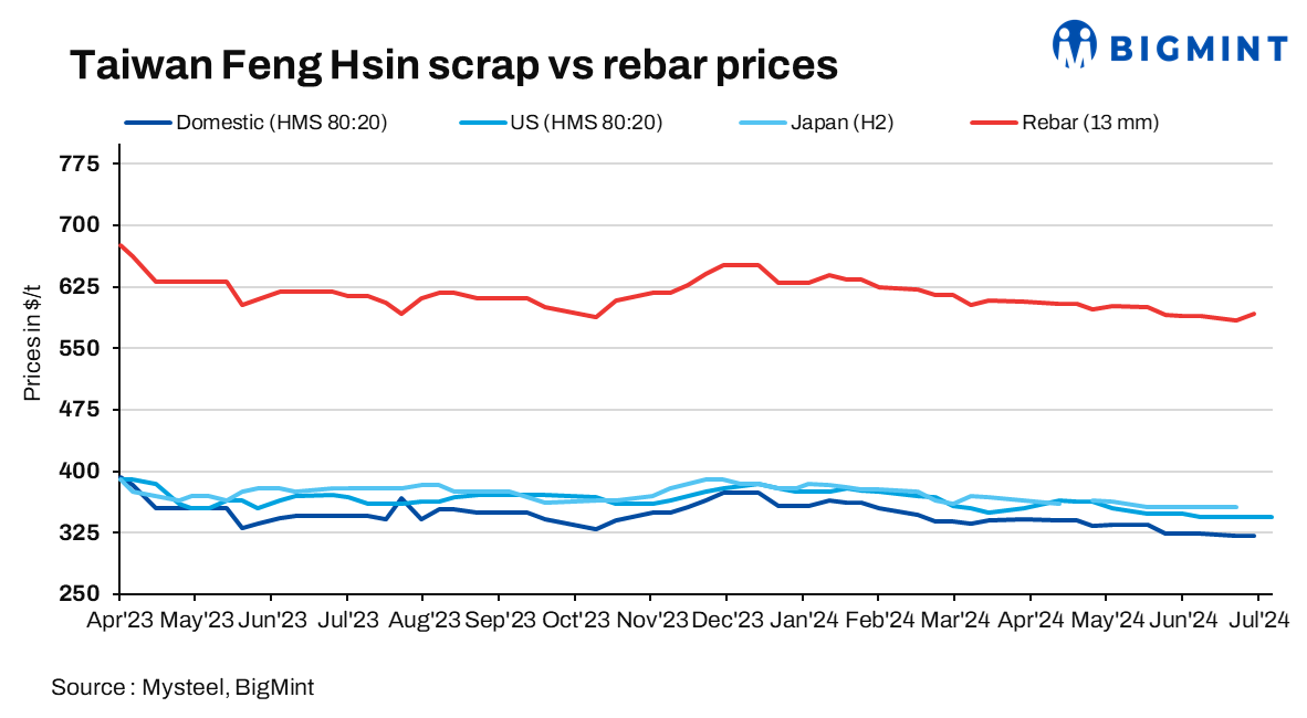 As of July 8, the price of US-sourced HMS 1&2 80:20 scrap came in at $345/t CFR Taiwan, the same level as a month ago, while the price of Japan-origin H2 scrap also stays at $357/t CFR Taiwan, unchanged since the start of June, the local market source said.