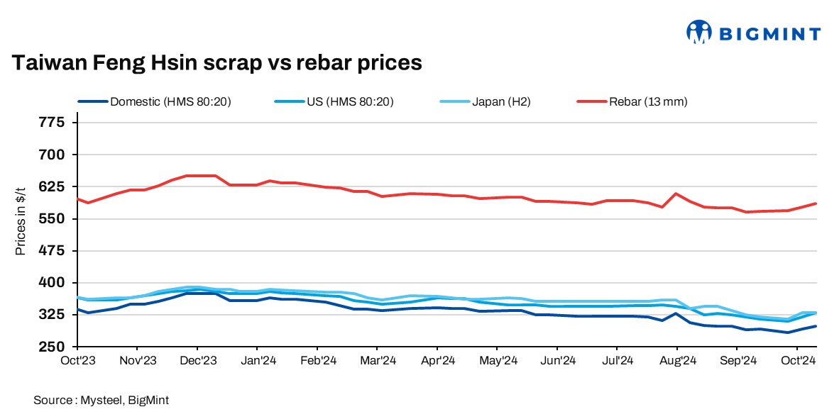 As of October 21, the price of US-sourced HMS 1&2 80:20 scrap was reported at $330/t CFR Taiwan, up for the second week by another $10/t on week, while the price of Japan-origin H2 scrap remained unchanged on week at $330/t CFR Taiwan, a local market source said.