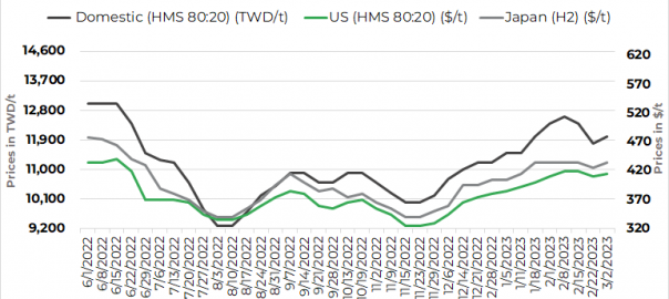 As of March 1, the price of US-sourced HMS 1&2 80:20 material was at $415/t CFR Taiwan, up $5/t from the previous week, while the price of Japan-origin H2 scrap posted a larger on-week rise of $10/t to reach $435/t CFR Taiwan, according to a local market source.