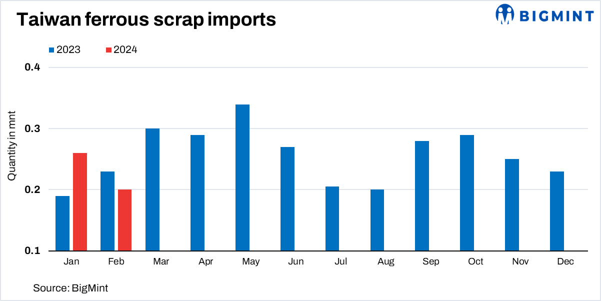 Taiwan: Ferrous scrap imports drop by 21% m-o-m in Feb’24