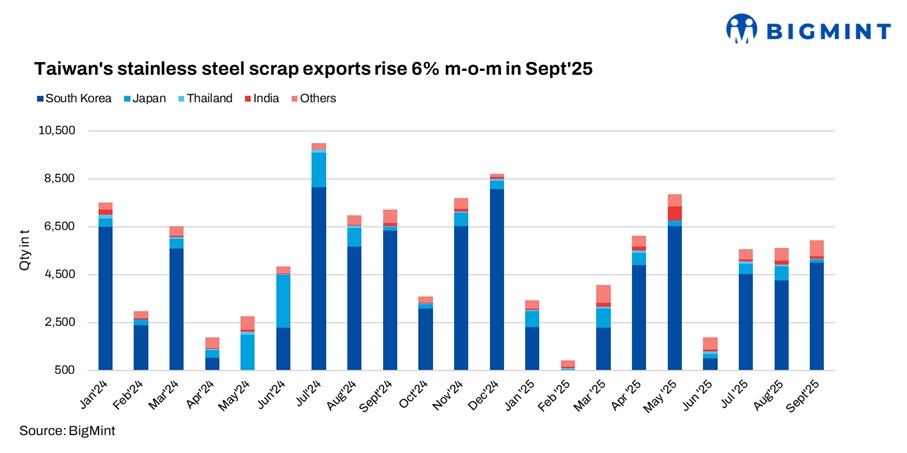 Taiwan’s stainless steel scrap exports increased 6% m-o-m in Sep’25 to 5,900 t from 5,600 t in Aug. However, total exports declined 18.5% y-o-y in Jan-Sep’25 to 41,000 t from 50,600 t last year. South Korea remained the largest buyer, importing 5,000 t in Sep, up 17% m-o-m, while Japan’s intake fell sharply to 142 t from 568 t in the previous month.