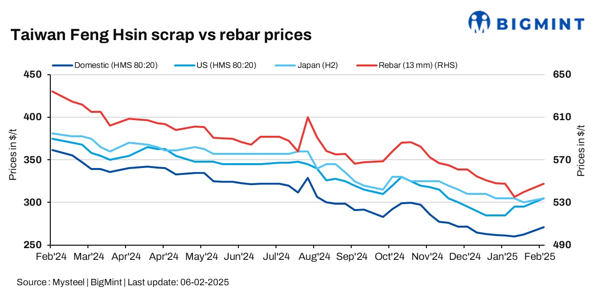 As of February 4, the price of US-sourced HMS 1&2 80:20 scrap was reported at $305/t CFR Taiwan, a $10/t increase from two weeks earlier. Similarly, the price of Japan-origin H2 scrap also rose by $5/t during the same period to reach $305/t CFR Taiwan, according to a local market source.
