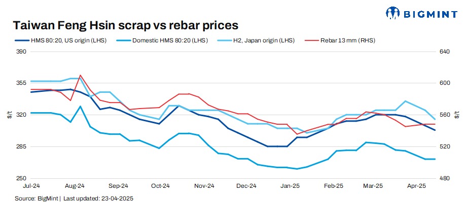 Feng Hsin is adopting a wait-and-see approach and is in no rush to further adjust its pricing, since it already trimmed its rebar list prices and local scrap procurement prices by a total of TWD 700/t and TWD 500/t respectively since late March.