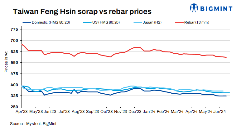 As of June 24, the price of US-sourced HMS 1&2 80:20 scrap came in at $345/t CFR Taiwan, the same level from the previous week, while the price of Japan-origin H2 scrap stayed at $357/t CFR Taiwan, also unchanged since the beginning of this month, according to a local market source.