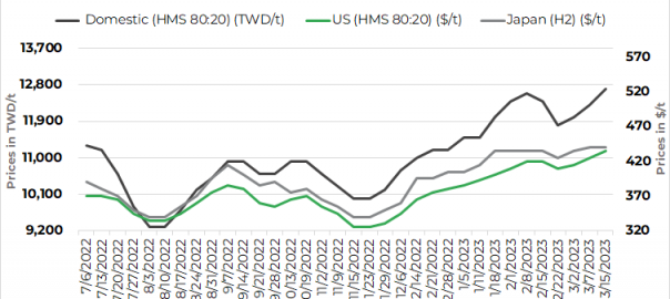After the adjustment, the mini-mill’s offering price for 13mm dia rebar reached TWD 21,500/t EXW for sales till this Friday, the highest since last July, while its buying price for local HMS 1&2 80:20 scrap climbs to a nine-month high of TWD 12,700/t, according to the official.