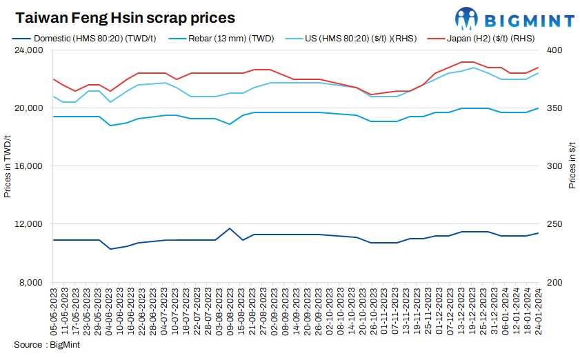 As of January 22, the price of US-sourced HMS 1&2 80:20 scrap came in at $380/t CFR Taiwan, gaining by $5/t on week, and the price of Japan-origin H2 scrap also increased by $5/t during the same period to reach $385/t CFR Taiwan, a local market source said.