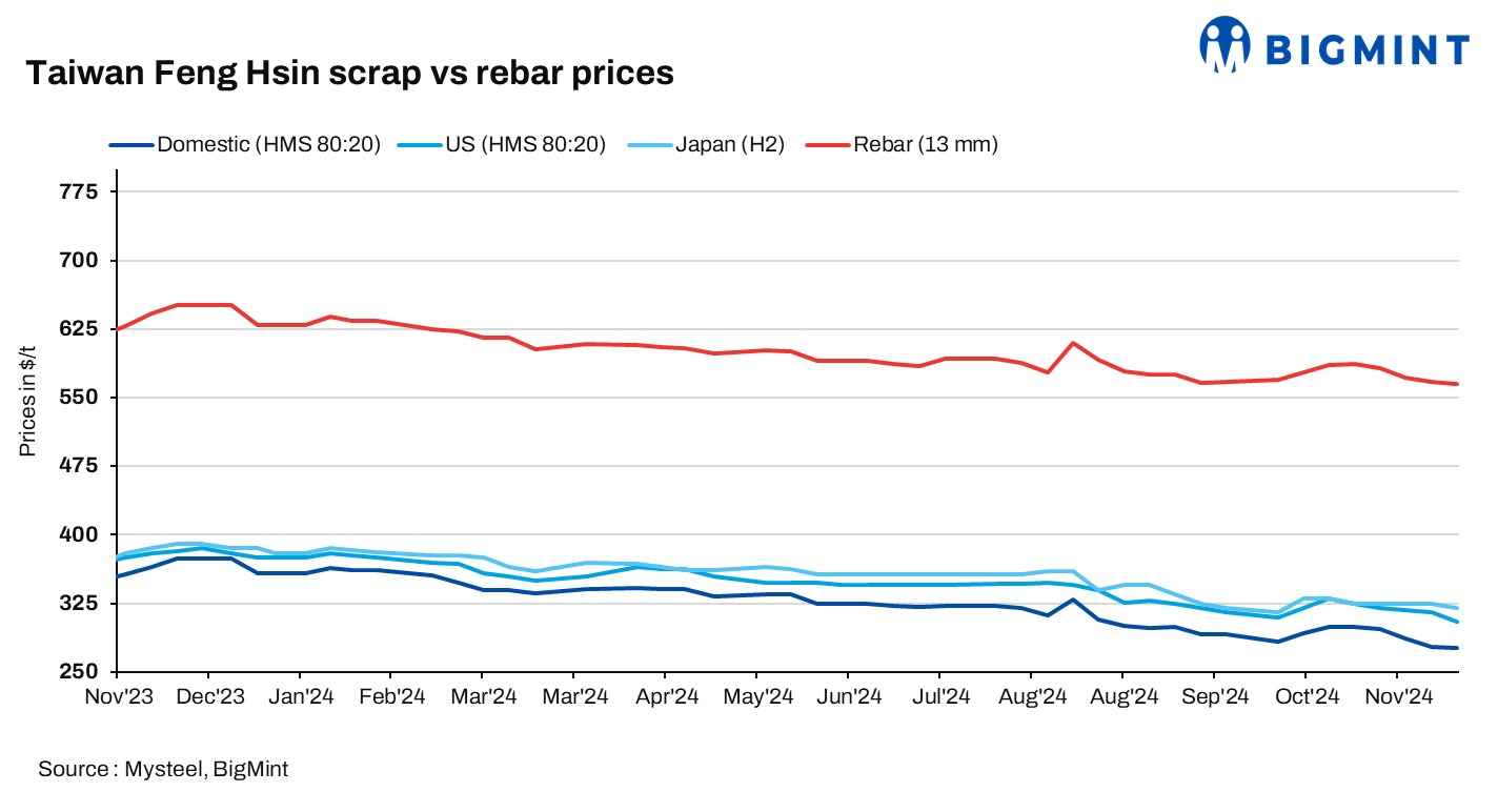 Prices of global scrap delivered to Taiwan have remained weak recently. The price of US-sourced HMS 1&2 80:20 scrap slipped by another $10/t on week to $305/t CFR Taiwan as of November 25, continuing a downward trend for the fifth consecutive week, while the price of Japan-origin H2 scrap was reported at $320/t CFR Taiwan, losing by $5/t from the prior week, a local market source said.