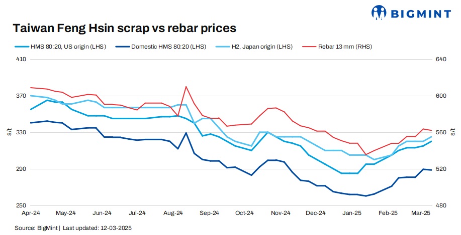 As of March 10, the price of US-sourced HMS 1&2 80:20 scrap was reported at $320/t CFR Taiwan, higher by $5/t on week, while the price of Japan-origin H2 scrap grew by $5/t on week to reach $325/t CFR Taiwan, according to a local market source.