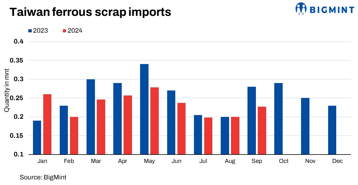 - In Sep’24, Taiwan’s ferrous scrap imports touched 227,706 t, up 13% from 200,790 t in Aug’24. Compared to Sep’23 (284,876 t), volumes dropped by 20%.
