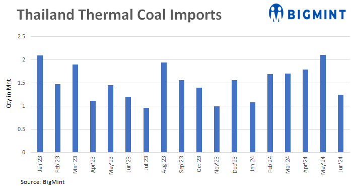- Thailand’s thermal coal imports fell to a five-month low to 1.25 mnt in Jun’24. Volumes have hit 5-month low since Jan’24, as per data maintained with BigMint.