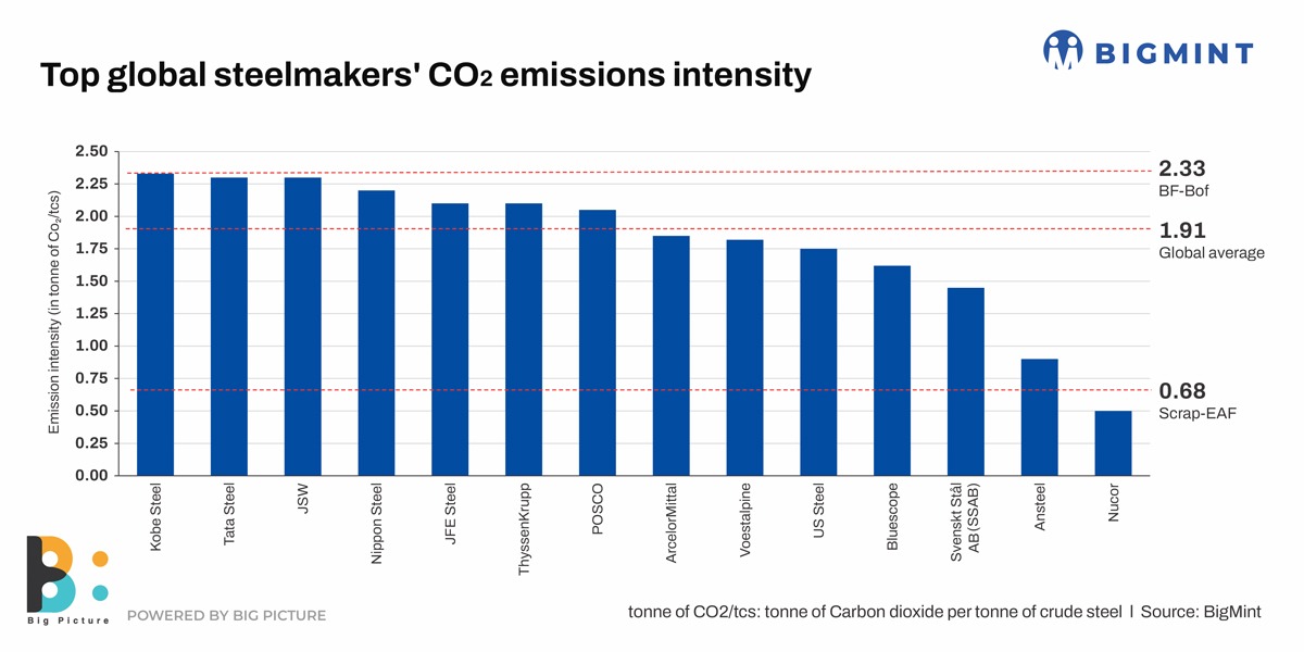 The average carbon emissions intensity of leading global steel producers, as per data collated by BigMint, is a tell-tale sign of the inherent structural difficulties involved in steel industry decarbonisation. Data reveal while steel companies in Japan, India and China – countries with a high share of BF-BOF steel production – typically have higher CO2 intensities, European and American steelmakers are far lower on the emissions scale. On the global steel industry decarbonisation scale neither are all countries – or companies – placed on an equal footing nor is the challenge to transition to low-carbon technologies equally difficult for all companies. Technology transition in the global steel industry can hardly happen during a fixed timescale or in one go for all the companies in the world.