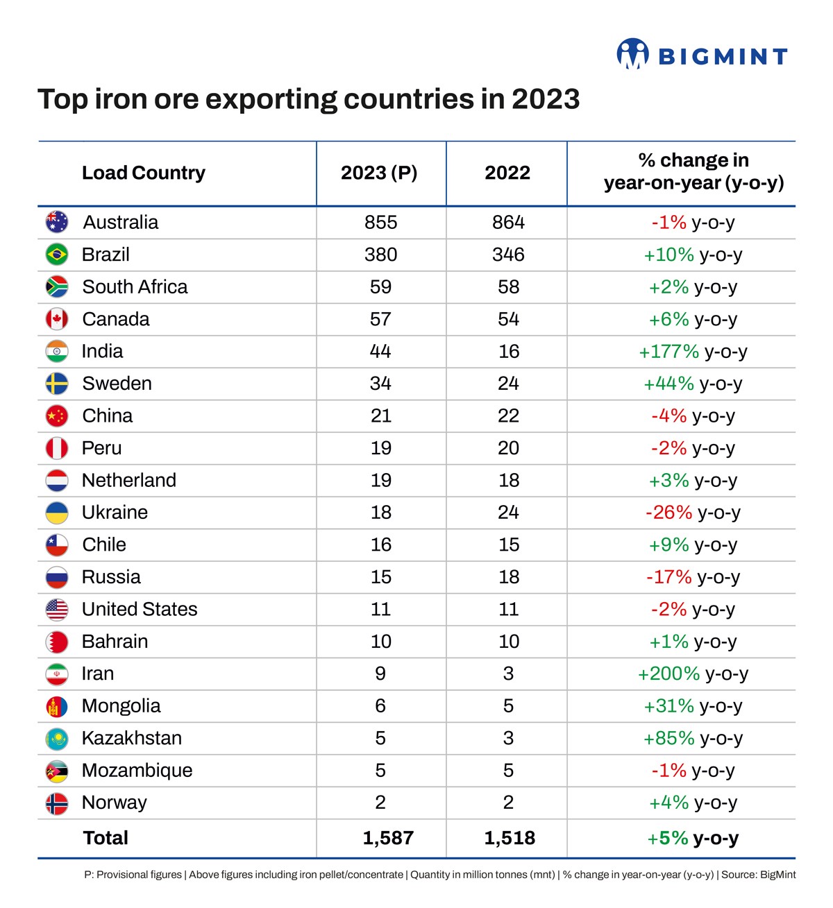 Global iron ore trade volumes inched up by around 5% on the year to 1.59 billion tonnes (bnt) in CY’23 from 1.52 bnt recorded in CY’22. The increase was wholly due to the marginal rise in Chinese crude steel production in CY’23 amid the lack of any definite policy of production cap of the Chinese government and high volume of steel exports, BigMint understands. With total iron ore and pellet exports totalling around 855 mnt, Australia accounted for around 54% of total global exports, while Brazil, the second-largest producer, accounted for around 24% of seaborne exports at over 380 mnt – up 10% y-o-y. Notably, exports of iron ore and pellets by India surged 177% y-o-y to 44 mnt from around 16 mnt.