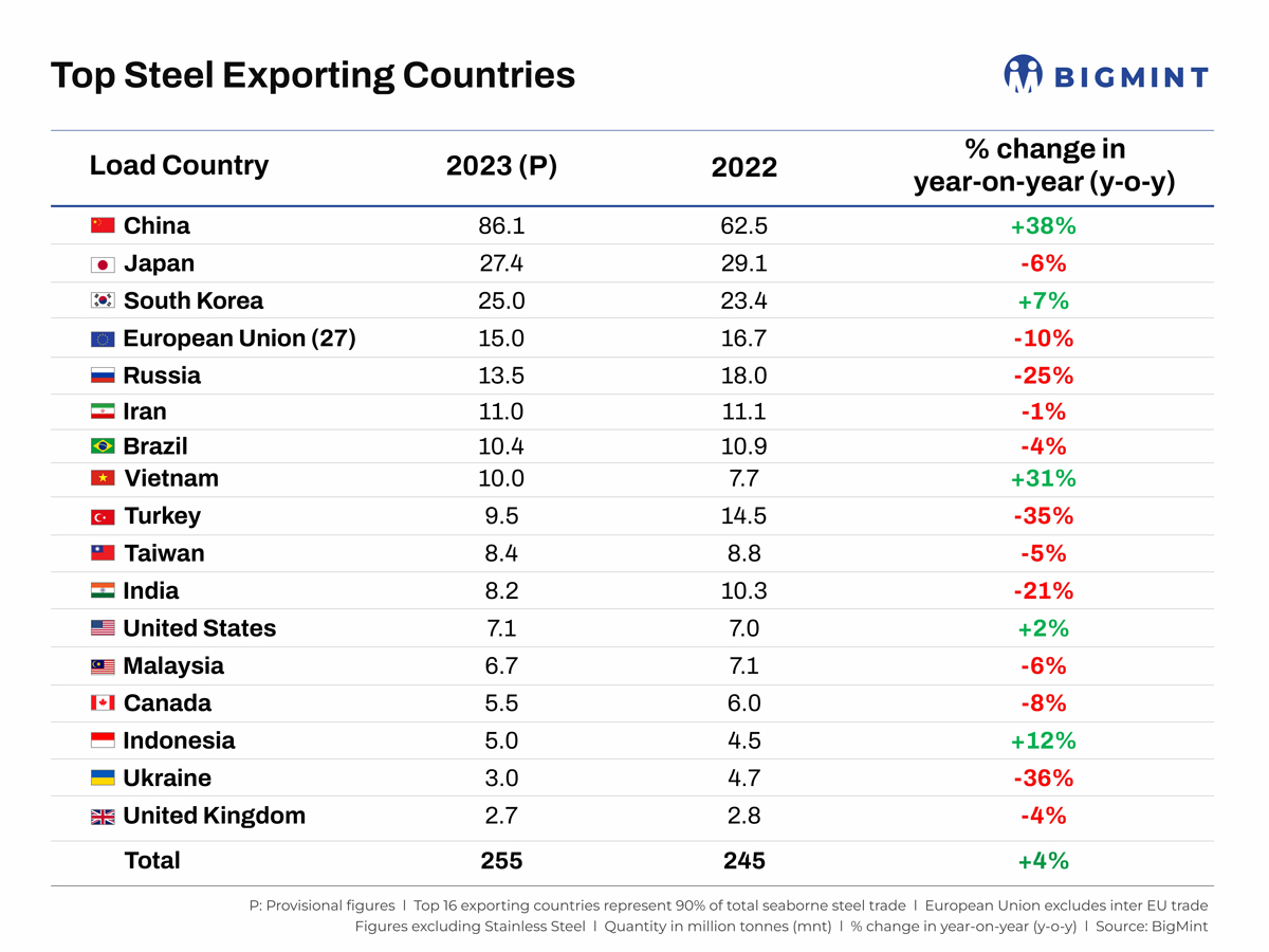 Global steel exports, excluding stainless steel, rose a nominal 4% to around 243 million tonnes (mnt) provisionally in calendar 2023 (CY’23) compared to 234 mnt in CY’22, as per data maintained with BigMint. The 16 countries tracked by BigMint contribute over 90% of the global seaborne steel trade. It was China, the largest steel exporter globally, which pulled up the overall export volumes as 11 of the 16 countries showed a y-o-y decline in a scenario where high interest rates, sliding currencies, inflation, and geo-political upheavals kept demand low. The European Union figures of 17 mnt considered exclude the intra-EU trade.