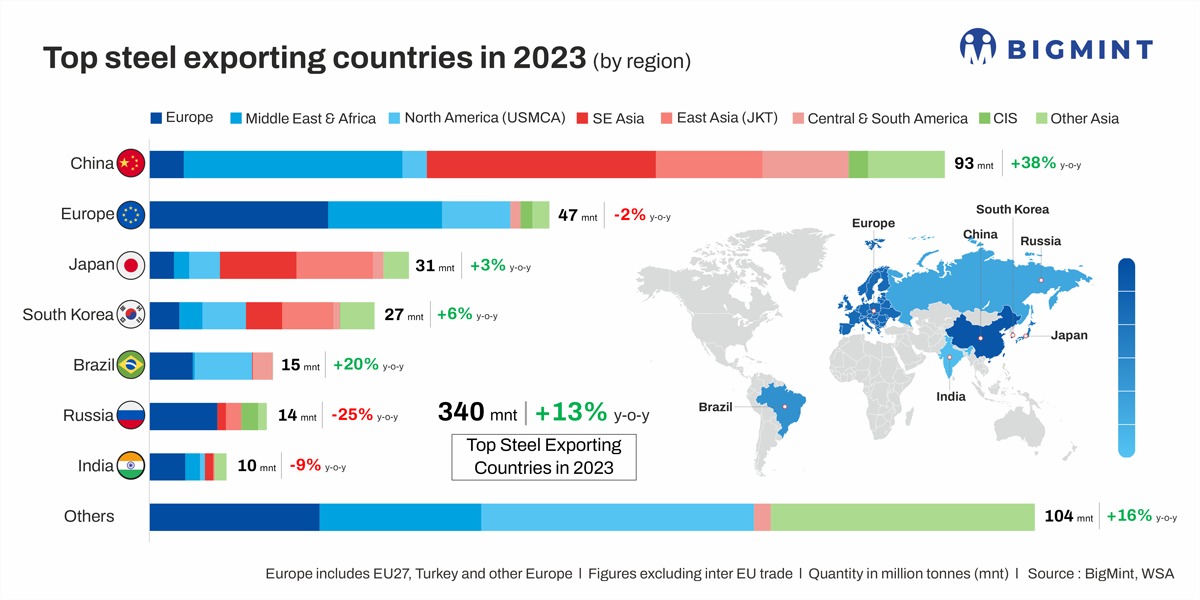 Global steel exports went up a moderate 13% in 2023, as per data collated by BigMint. China, of course, led the charts, with a hefty 38% increase to 93 mnt last year against 67 mnt in 2022. On the other hand, India’s volumes fell 9% y-o-y while Russia saw a significant 25% decline. Other exporting geographies volumes remained more or less stable in this period. Europe (excluding the EU intra-trade) was a distant second with 47 mnt and Japan followed with 31 mnt.