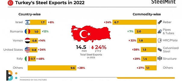 Turkey exported over 14.50 mnt of finished steel in 2022 – 8 mnt of longs and 6 mnt flats, but the total is down y-o-y by 24% against 19 mnt in 2021. As a result, crude steel production was down 12% y-o-y.