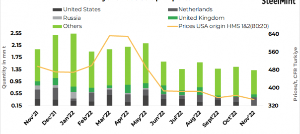 Turkiye’s ferrous scrap imports decreased by 8% to 1.33 million tonnes (mnt) in November 2022 as compared to 1.44 mnt in October, as per customs data. Import volumes fell due to a decline in exports by major suppliers like USA which had increased its exports to other active markets like India.