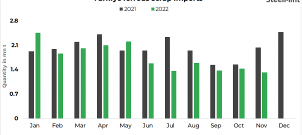 - Turkiye’s ferrous scrap imports were recorded at 1.33 mnt in Nov’22, slightly down by 8% m-o-m from 1.44 mnt in Oct’22, as per SteelMint’s data.