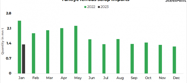 - Turkiye’s ferrous scrap imports were recorded at 1.36 mnt in Jan’23, higher by 8% m-o-m from 1.26 mnt in Dec’22, as per SteelMint’s data.