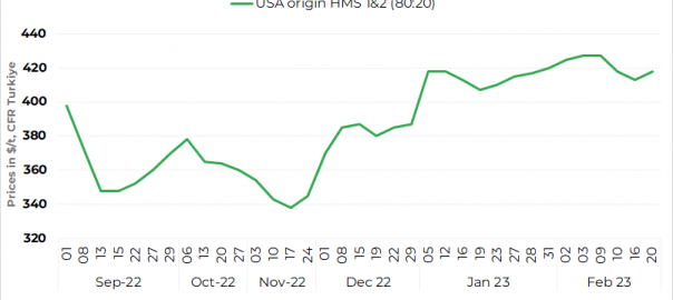 • A cargo containing 5,000 t of HMS(80:20), 8,000 t of busheling, 15,000 t of PNS, and 12,000 t of shredded was booked at $418/t CFR Turkiye, for Mar’23 shipment.