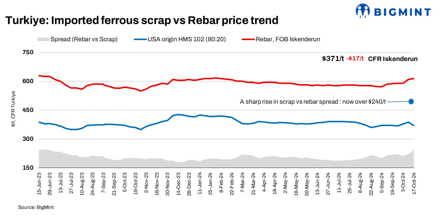 Currently, the scrap-to-rebar spread stood at $244/t, with rebar prices at $615/t and US-origin HMS (80:20) at $371/t CFR.