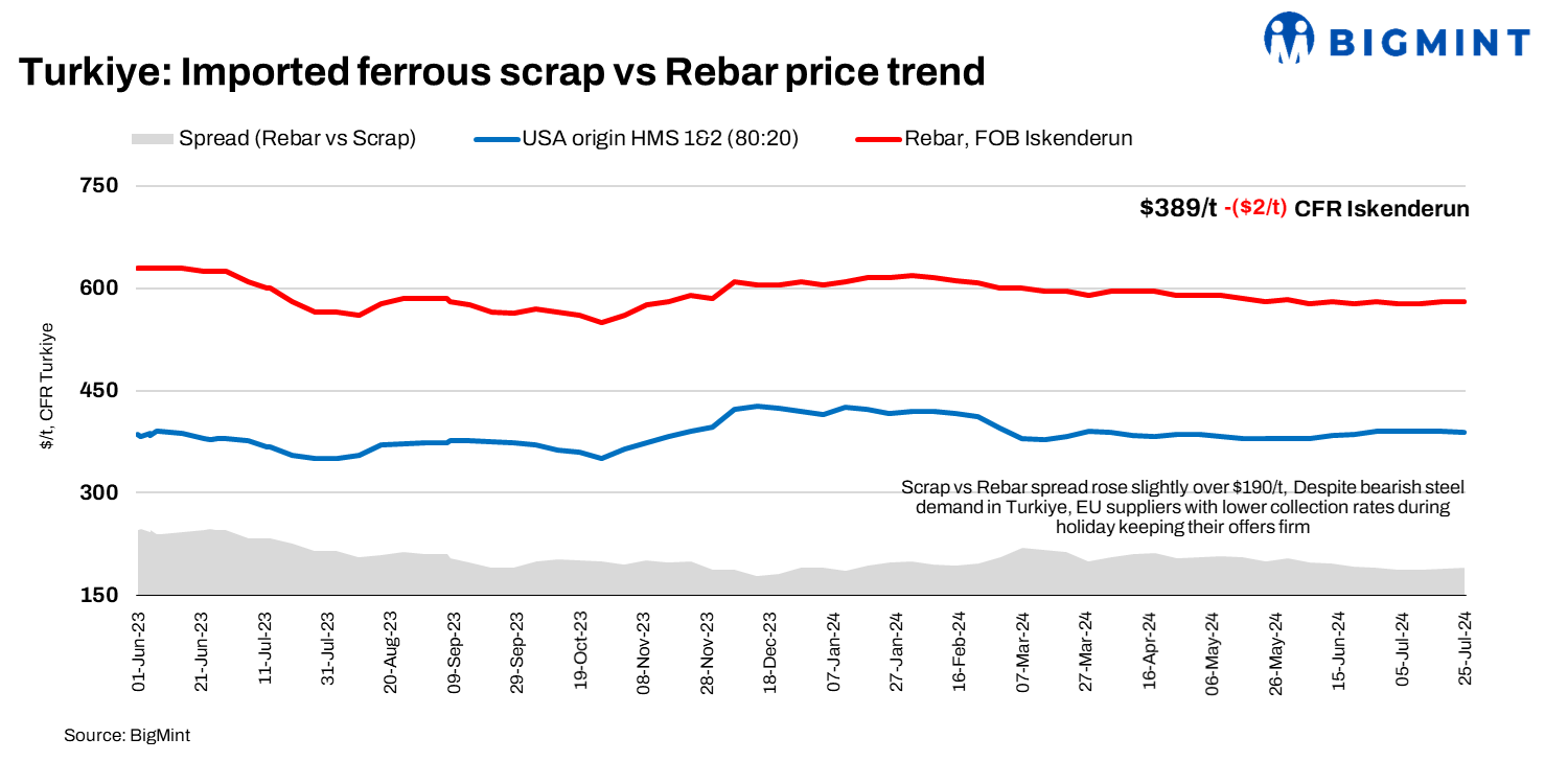 BigMint’s assessment for US-origin HMS (80:20) bulk scrap stood at $389/t CFR, down by $2/t w-o-w.