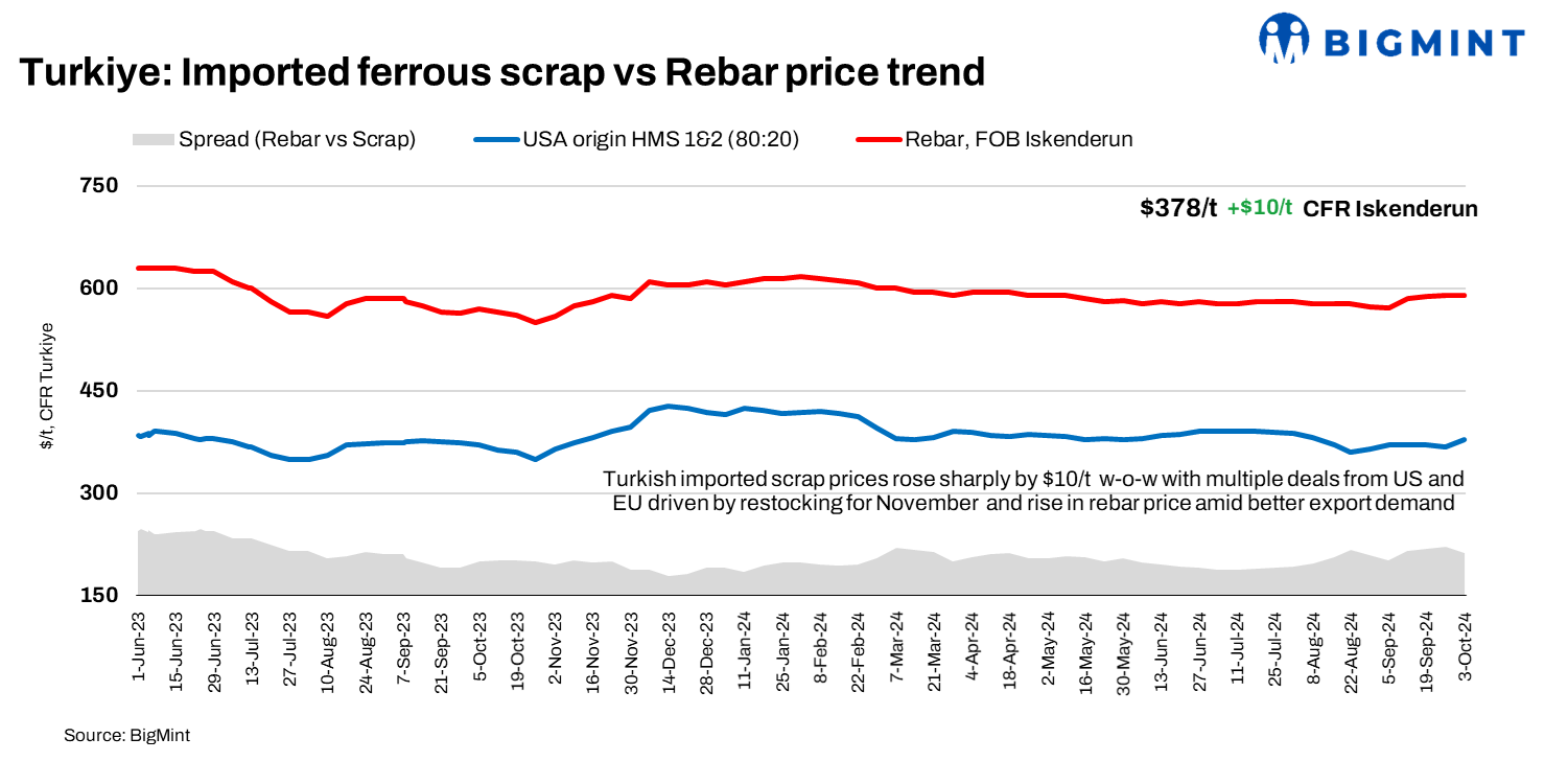 Turkish imported ferrous scrap prices rose significantly by $10/t w-o-w, as steel producers are actively securing deep-sea scrap for November shipments at rising prices, driven by increasing steel and iron ore offers in China and improved demand in Turkiye’s longs markets. The uptick in prices is largely attributed to domestic long steel demand and a strengthening Chinese market, supported by recent government stimulus measures that have improved sentiment.