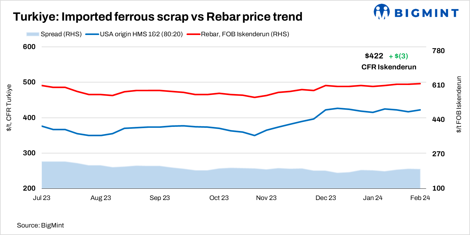 BigMint’s assessment for US-origin bulk HMS (80:20) recorded a $3/t w-o-w rise, reaching $422/t CFR Turkiye.