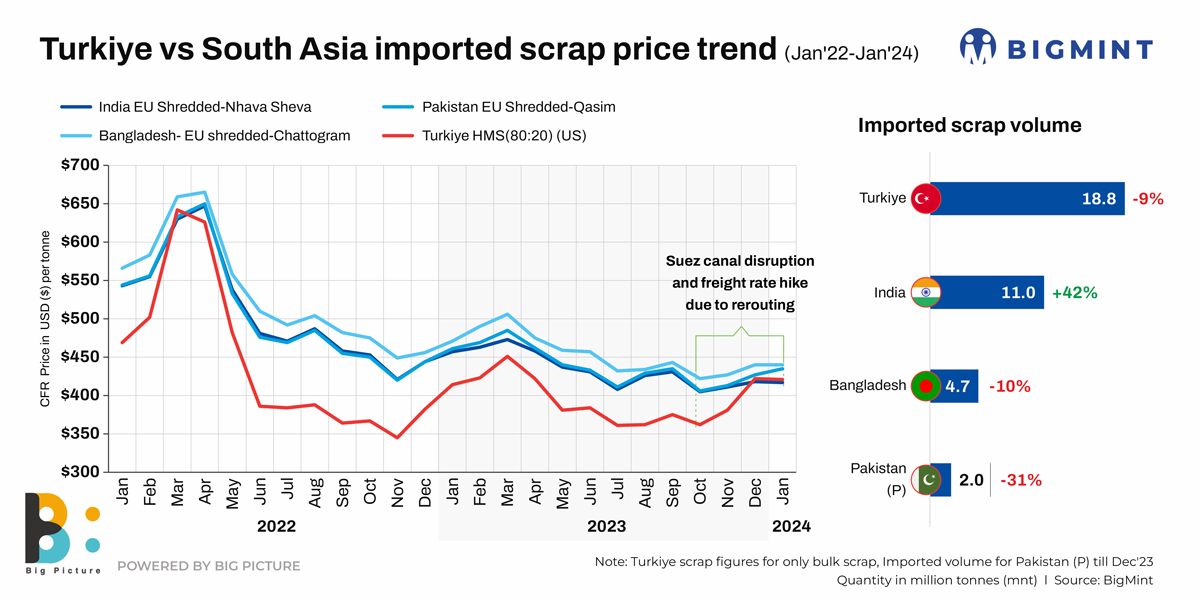 Geo-political impact: The Red Sea incident (which erupted on 19 October, 2023) hiked freight rates as ships had to detour. This led to longer voyages, supply chain disruptions and extra security charges for vessels, impacting freight rates upwards. Bulk scrap prices into Turkiye witnessed a 16% increase in January 2024 at $421/t compared to the $362/t levels in October 2023.