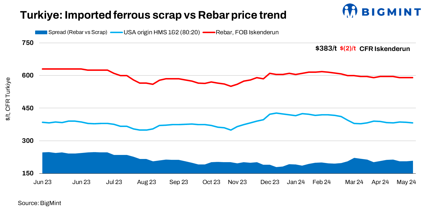 Turkish exported rebar stood at $590/t FOB. The scrap-to-rebar spread was assessed at $205-207/t FOB, remaining range-bound as compared to last week.