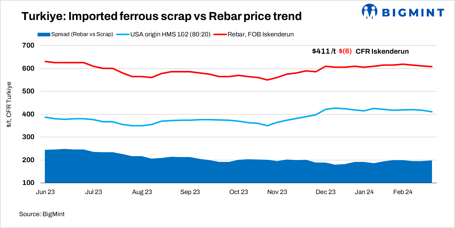 The Turkish rebar export prices remain slightly down to $608/t FOB, and buyers sought lower scrap prices, indicating a potential drop to $400-$405/t CFR.