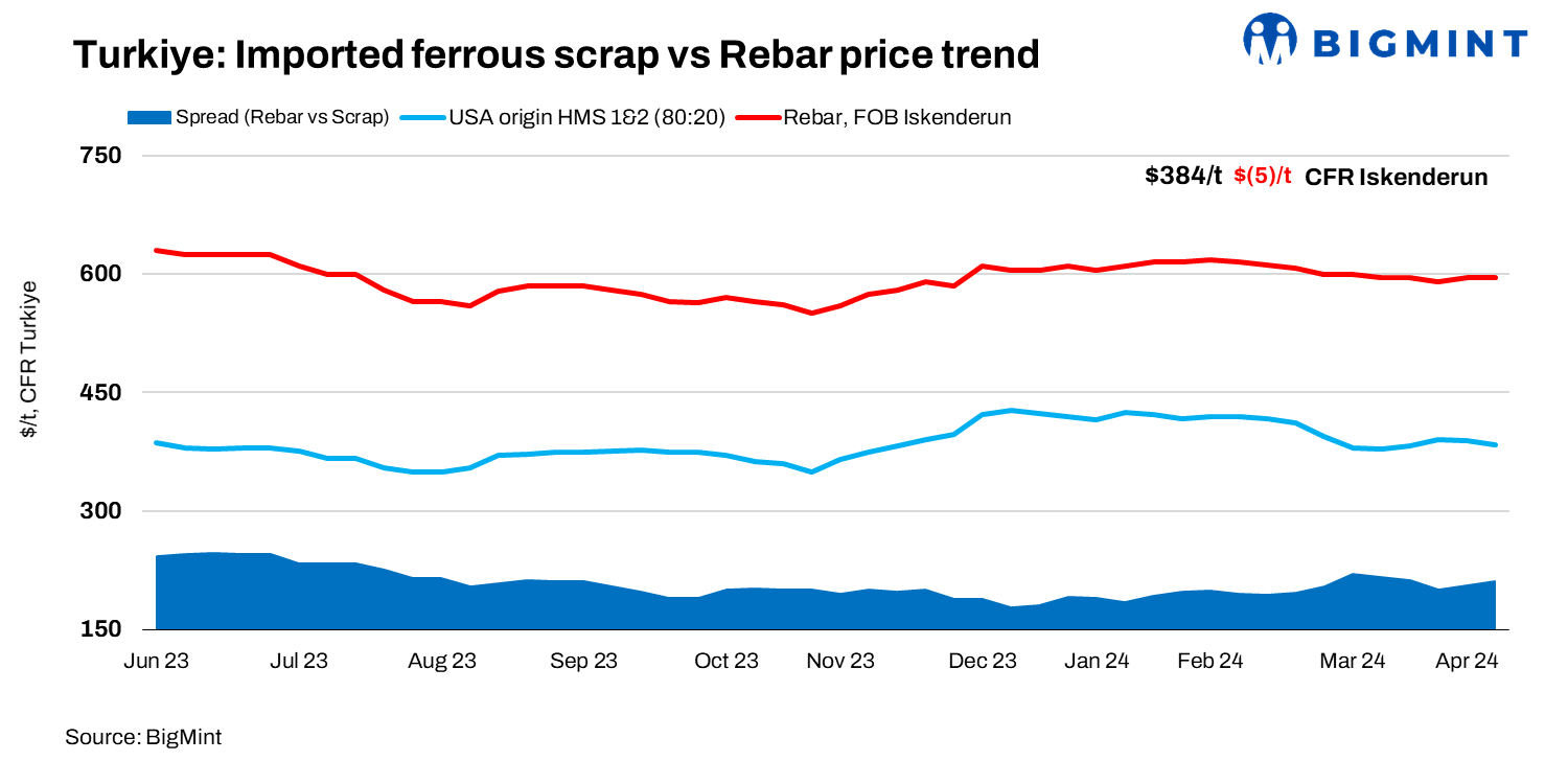 - BigMint’s weekly rebar assessment stood at $595/t FOB Iskenderun. The scrap-to-rebar spread has increased to $210-211/t as of now.