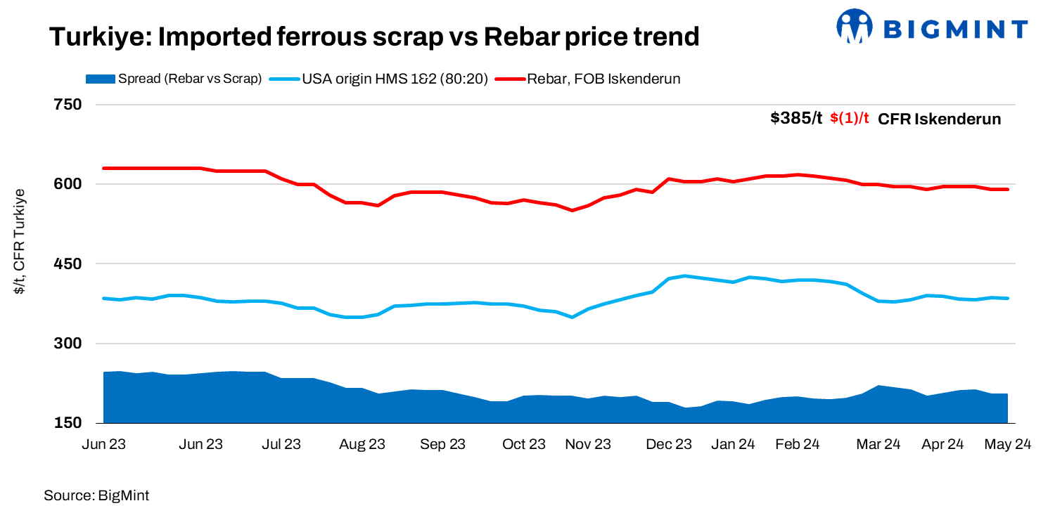 As per a mill source, scrap prices should drop to below $350-355/t CFR to remain competitive amid the threat of Chinese steel exports. High scrap costs could lead to Turkish EAF producers losing market share to Chinese competitors.