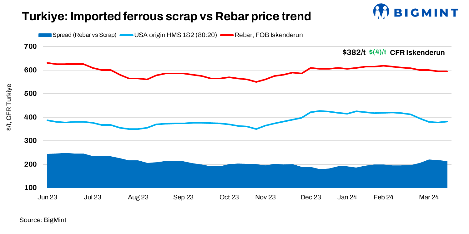 BigMint’s weekly rebar assessment stood at $590-595/t FOB Iskenderun. The scrap-to-rebar spread has narrowed down to $210-213/t as of now.
