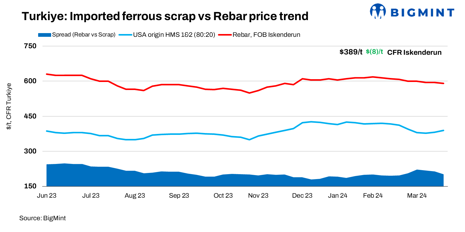Turkish exported rebar stands at $595/t FOB. The scrap-to-rebar spread was assessed at $205/t FOB, narrowing from $213/t last week.