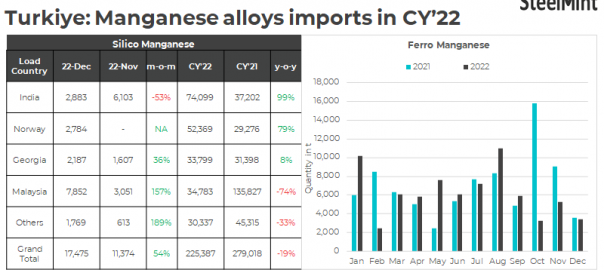 - However, on a monthly basis, manganese alloys imports increased by 25% at 20,909 t in Dec’22.